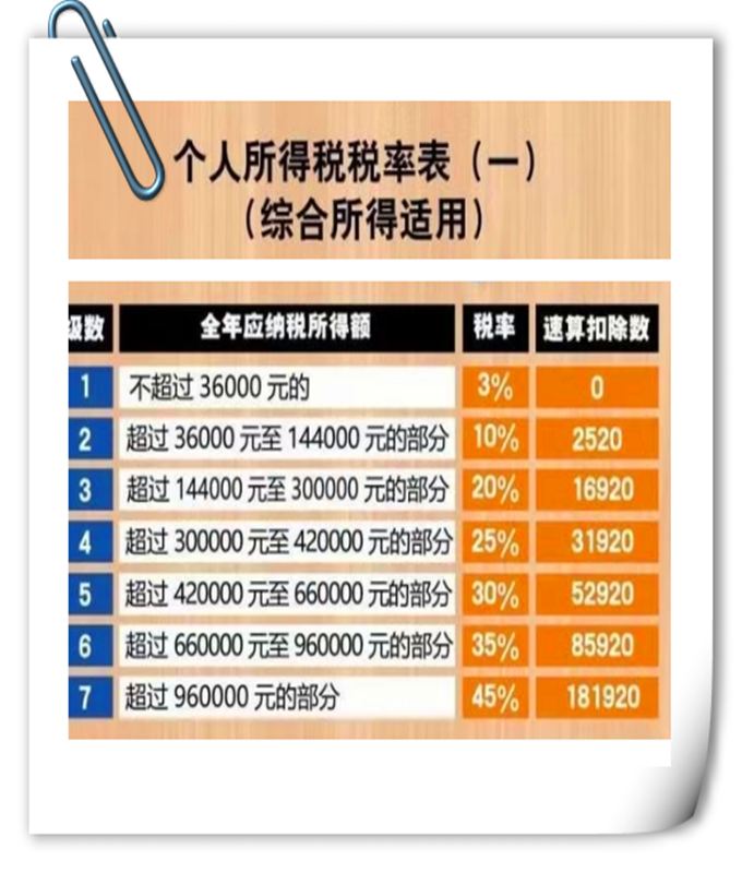 1、综合所得,适用百分之三至百分之四十五的超额累进税率(税率表附后);